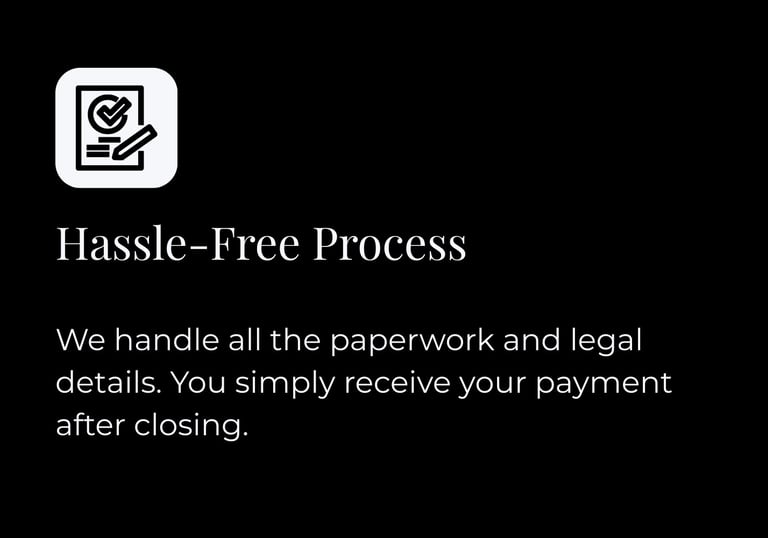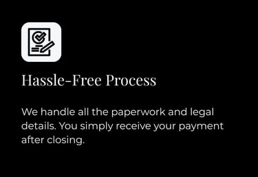Accept the offer and choose your closing date. We handle all paperwork and details. Receive your payment at closing.